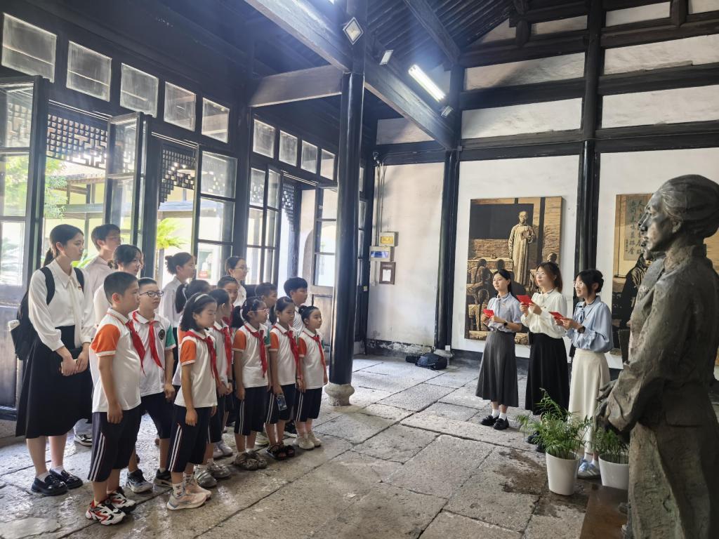 作为秋瑾策划反清起义的重要据点和被清兵包围逮捕地,大通学堂的青砖黛瓦间仍镌刻着革命的呐喊。在讲解员的带领下,同学们走进当年的寝室、器械室,透过泛黄的史料和复原的场景,重温秋瑾以“体操课”为掩护培养革命力量的峥嵘岁月。宣讲团成员以《体操课里的革命火种:秋瑾与大通学堂的1907》为题,讲述了秋瑾如何在此传播“驱除鞑虏,恢复中华”的革命思想,并秘密教授学生射击、马术,将学堂打造成武装起义的摇篮,成为当时浙江革命的大本营。秋瑾小学的少先队员们分享感悟时,稚嫩的话语中流露出对革命精神的深深敬仰。