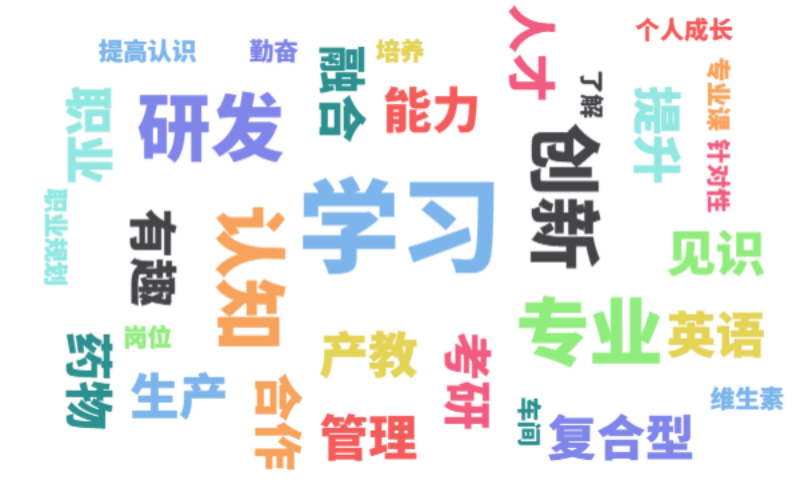 研学活动结束后,我们对同学们就活动成效进行了在线问卷调查。根据调查结果,学生对本次研学活动的满意率达到100%,其中非常满意达73%以上(图5a)。本次研学活动给学生在学业情况、职业规划、自我了解和团队合作方面都带来了提升,其中感觉对学业情况和职业规划有利的同学都达到了90%以上(图5b)。100%的同学认为对未来的学业和就业规划有了更清晰的认识(图5c)。在学生对本次活动的体会中,学习、专业、复合型、职业、英语、见识等正向词语成为了高频词汇,体现了研学活动对他们的促进和启发作用(图5d),为同学们今后的专业学习和职业规划指明了方向。