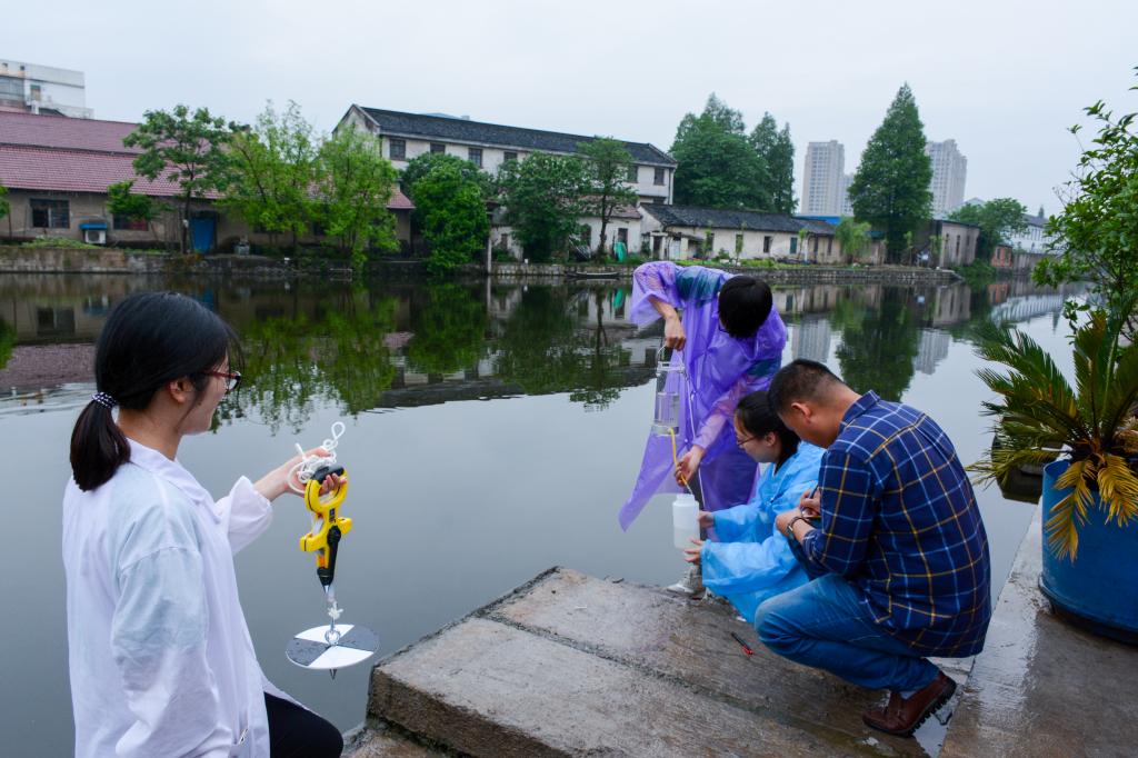 在斗门镇外谷社村的官家溇河区域,记者看到,水质监测小分队正在用取水器到河道取水,将水样装入试剂瓶,环科专业大三学生邱晓涵在接受记者采访时表示,在现场,他们要检测记录水体的见度、嗅味、温度和ph值,并将水样带回实验室深入检测,如电导率、细菌总数、BOD(五日生化学需氧量)、COD(化学需氧量)和氨氮含量等指标,用专业知识提供数据,与学院专业团队老师讨论出最佳的河道治理方案。