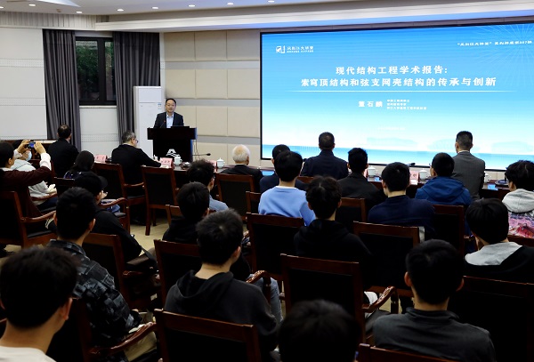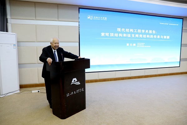 董石麟院士从空间结构的发展史与分类、索穹顶结构国内外发展与应用、多序列多撑杆索穹顶的创新研究、弦支网壳结构国内外发展应用与创新、索穹顶与新型弦支网壳的对比分析等五个方面,对索杆梁膜组成的现代空间结构索穹顶与弦支网壳的应用与发展作了详细说明。整个报告贯穿了丰富的具体工程案例。报告最后,他鼓励在场师生们,要以对土木专业的热爱和执着,全身心投入到科研创新中去,共同推进我国空间结构事业持续性发展,为实现国家科技事业从大国向强国迈进贡献自身力量。