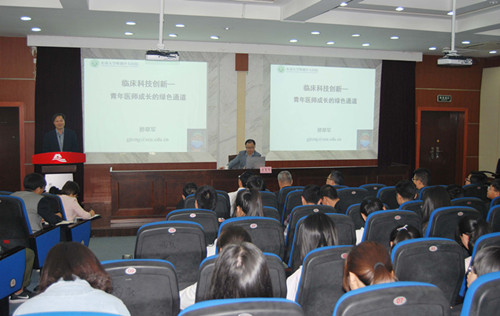 4月28日上午,我校放射专业82届校友、东南大学附属中大医院院长滕皋军教授作客“杏林讲堂”,结合自身的求学经历和学术经历,为我校医学生讲解青年医师成长的绿色通道——临床科技创新。校党委委员、医学院党委书记柳国庆和医学院师生200余人聆听了讲座。讲座由校附属医院副院长夏瑞明主持。