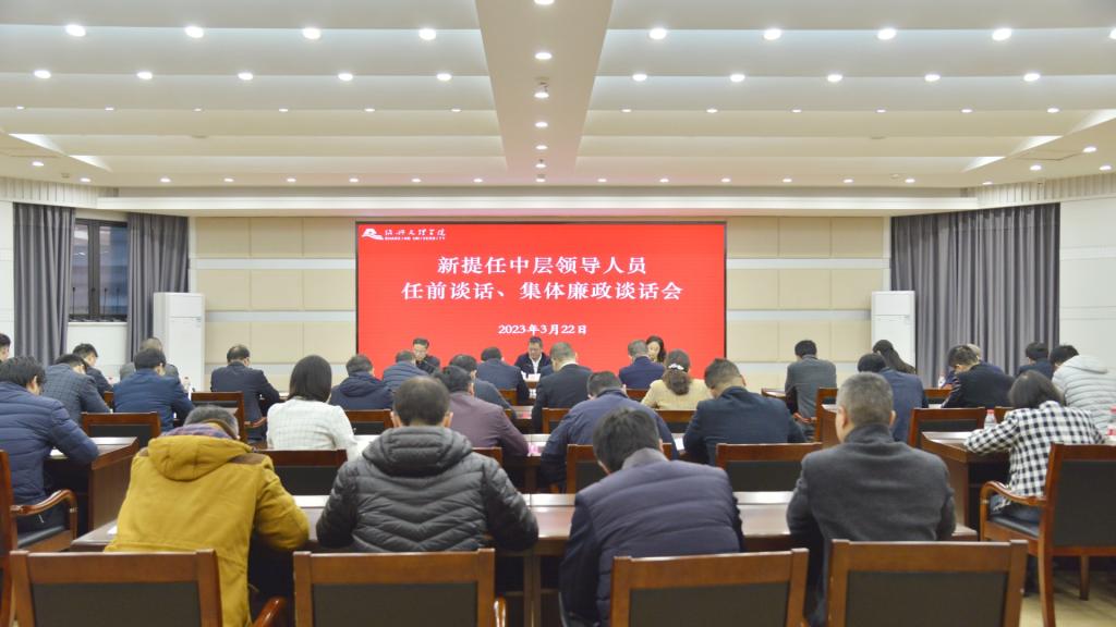 3月22日下午,学校新提任中层领导人员任前谈话、集体廉政谈话会在图书馆一楼报告厅举行。校党委副书记沈赤,校党委委员、纪委书记、监察专员柯羽,党委委员、组织部部长宣绍龙,48名新提任中层领导人员参加谈话会。会议由宣绍龙主持。