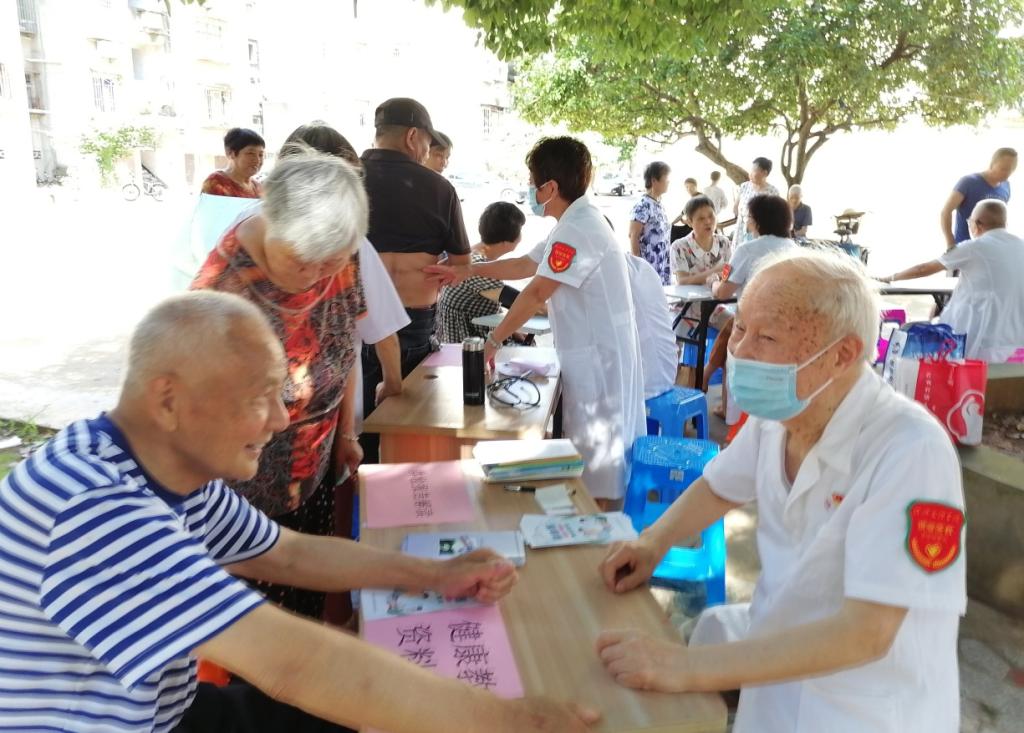 在服务队顾问、健康教育科普宣传专家洪立昌高级讲师的桌前,许多居民前来咨询老年病、慢性病的饮食调养、心理调节、运动锻炼等健康保健问题;名誉队长、钟建平主任中医师接待着有中医义诊咨询需求的居民;汪绿宁主任医师接待着有耳、鼻、喉科方面疾病义诊咨询需求的居民;全科医学蒋月琴主治医师、内科学王月钗主治医师分别接待着有全科医疗、普通内科方面的慢性、常见、多发疾病义诊咨询需求的居民;单敏娟副主任护师负责忙碌的测量血压等工作;名誉队长徐杏根和队长王建华负责组织协调、维持秩序等。队员们热情地接待着每位前来义诊咨询的居民,耐心倾听诉说,仔细察看症状,科学解读检查与体检报告,认真分析病因,通俗解答疑问,疏导心理“疙瘩”,提供科学防治方法,给予个性化的康复保健建议。
