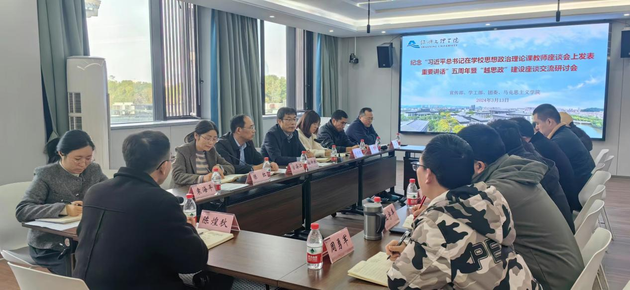 今年是习近平总书记在学校思想政治理论课教师座谈会上发表重要讲话五周年,为深入贯彻落实习近平总书记重要讲话精神,推进思政课改革创新,切实把“思政课打造成落实立德树人根本任务的关键课程”落细落实。3月13日下午,宣传部、学工部、团委和马克思主义学院联合举办纪念“习近平总书记在学校思想政治理论课教师座谈会上发表重要讲话”五周年暨“越思政”建设研讨会。学工部主要负责人,宣传部、团委有关负责人,马克思主义学院全体班子成员,省思政课名师工作室、思政精品项目负责人,思政专业主任,各思政课教研室主任,思政课教师代表和二级学院党委副书记代表、辅导员代表参加会议。会议由马克思主义学院党委主要负责人主持。