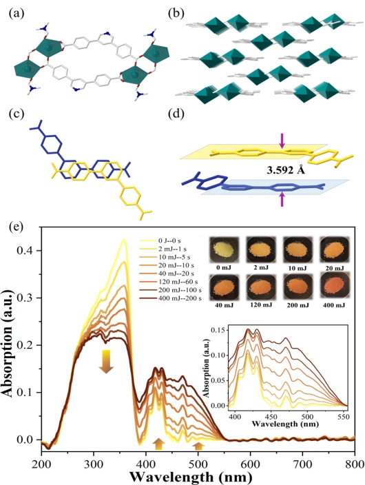 利用单晶X射线衍射技术对SXU-1晶体结构进行解析,发现其整体呈一维链状结构(图b)。一个不对称单元中含有一个铀酰离子,一个有机配体和两个DMF分子。其中,相邻的两个有机配体相互平行,距离约为3.592 Å,说明二者之间具有明显的π-π相互作用,从而稳定整体结构(图c,d)。利用固态光谱仪测试了紫外光照射过程中材料的UV-vis吸收光谱的变化,发现随着光照时间的延长,200-400 nm处的吸收峰强度降低,400-550 nm处的吸收峰强度增强(图e)。