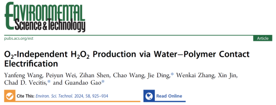 上述研究以“O2-independent H2O2 production via water-Polymer contact electrification”为题于2023年12月20日在线发表于Nature index期刊(环境领域顶级期刊)Environmental Science & Technology。论文第一作者为我校生命与环境科学学院王炎锋博士(我校为第一单位),通讯作者为南京大学的高冠道教授、丁杰助理研究员以及哈佛大学的Chad D. Vecitis教授。研究得到了国家自然科学基金、中国博士后科学基金和污染控制与资源化研究国家重点实验室开放基金等资助。