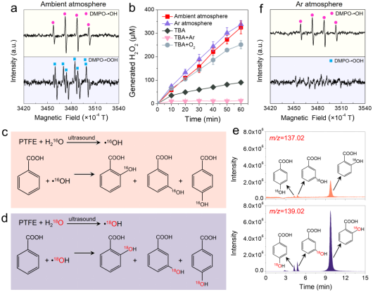 催化剂浓度从1 mg/L增加到100 mg/L, H2O2浓度从37.8 ± 5.2增加到324.8 ± 27.2 μM,整个反应过程符合零级动力学特征;在无催化剂以及以TiO2为催化剂的体系中,H2O2的产量几乎可以忽略不计,证实H2O2是由PTFE催化主导产生;循环实验证实PTFE催化剂非常稳定;与常见的光催化剂和压电催化剂对比后发现,PTFE催化剂显示出最佳的H2O2合成性能。