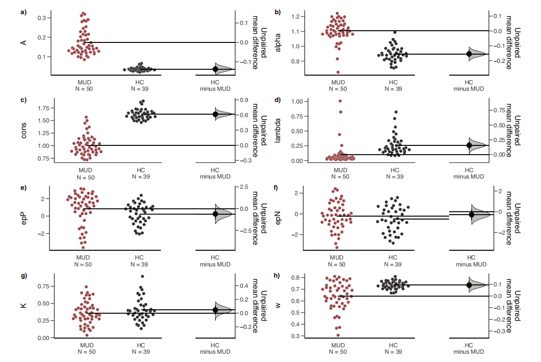 根据以往的研究,作者采用“价值加坚持”(Value-Plus-Perseverance,VPP)IGT模型来探究决策的具体变化过程[7]。该模型由八个自由参数组成,分别为学习率(A),结果敏感性(α),反应一致性(cons)厌恶损失函数(lambda),获益影响(εp),损失影响(εn),选择衰减速率(K)和强化学习权重(ω)。结果发现,与健康对照组相比,MUD患者在IGT中的表现较差,其VPP模型参数存在异常。MUD组的学习率(A)和结果敏感性(alpha)参数值明显较高。相反,其反应一致性(cons),损失厌恶函数(lambda),和强化学习权重(ω)参数值较低。这表明,与健康组相比,MUD患者决策能力存在缺陷,决策过程异常。