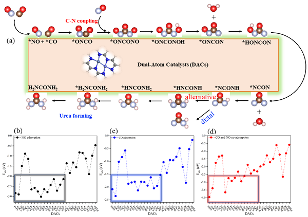 当前尿素是通过CO2与NH3在高温高压条件下合成的, 这一过程不仅耗能极大且不环保。因此, 探索高性能的电催化剂在常温常压下用于尿素合成具有重要意义。在这个工作中, 基于密度泛函理论计算, 作者构建了一系列双原子催化剂, 以两种气体污染物(NO 与CO)作为N 源与C源进行C-N偶联产尿素。结果表明稳定吸附的NO 与CO 能够促进C-N 偶联以及连续的氢化反应。通过筛选, CoZn, CoCu, and FeZn@N6/C 催化剂能够持续的接受质子/电子对, 实现尿素的生成, 分别表现出−0.27, −0.30, 和 −0.60 V 的过电位。同时尿素产生是遵循 alternative 机制 。此外, 引入溶剂化效应与恒电势模型探索了在真实反应条件下C-N耦合动力学能垒, 只有0.75 eV。竞争性反应如HER 与NRR 也得到了很好的抑制。因此表现出产尿素的高选择性在这三种电催化剂上。