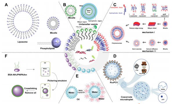 图1展示了典型合成细胞不同支架的结构示意图,包括不同磷脂质自组装形成的脂质体、脂肪酸自组装形成的囊泡、聚合物体的形成、无膜凝聚体结构的自组装过程,以及功能化的胶体囊泡策略,这些结构为人工细胞的设计和功能实现提供了多样化的材料和方法。