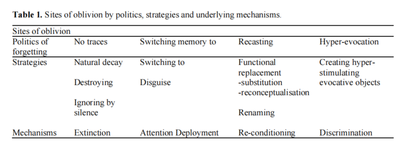 其次,本研究探讨了社会如何通过一系列复杂的机制和策略实现集体遗忘。Assmann (2014)提出了五种策略来排除对集体身份有害的记忆,这些策略旨在减少对集体身份有害的记忆对个体和集体的影响,包括相互承认罪责、外化罪责、心理盲区、沉默和篡改历史,并强调了通过记忆、处理和悔改来释放过去负担的重要性。Ankersmit (2001)区分了遗忘的四种原因,涉及身份、意识、痛苦经历和新身份的获取。Harmanşah (2014)通过田野研究识别了遗忘策略,包括形成新叙事、忽视物质遗迹、通过更名创造新的象征性地理、选择性记忆和将其他群体的遗产保留在从属位置。Connerton (2009)提出了一个广泛引用的集体遗忘机制列表,涵盖了自上而下和自下而上的遗忘路径。尽管这些分类提供了对遗忘过程的深入了解,但仍需进一步研究遗忘的社会机制。