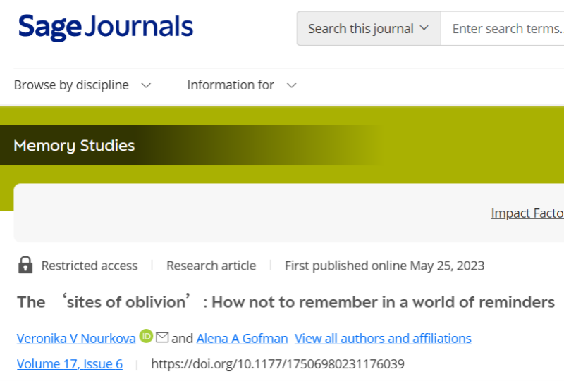 近日,久久精品一区二区|久久久一区二区三区|欧美日韩视频|欧美福利视频|高清欧美性猛交xxxx黑人猛交|久久久www成人免费精品|在线观看成人网站大脑、心智与教育研究中心、心理学系Veronika V Nourkova教授作为第一作者在国际认知心理学权威期刊Memory Studies (IF = 2.52, 中科院I区)期刊上发表了题为The ‘sites of oblivion’: How not to remember in a world of reminders的研究论文。该研究围绕记忆领域内的遗忘价值和遗忘策略进行了理论探讨,开创性地提出了“湮没之地”(sites of oblivion)的概念。