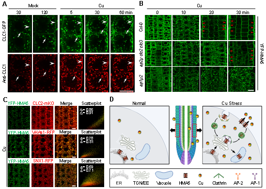 铜(Copper)是生命的基本元素,是微量元素界的“低调贵族”。同时,铜又是一把“双刃剑”:铜太少细胞无法生存,太多又会造成细胞死亡。因此,了解植物响应铜胁迫的分子机理,对铜污染土壤中植物的生长发育和农产品安全至关重要。近年来研究证实,网格蛋白通过调控质膜蛋白的内吞通量或特定质膜蛋白的胞内运输来帮助植物响应重金属胁迫。然而,有关CMT与植物铜胁迫响应的相关性研究尚属空白。