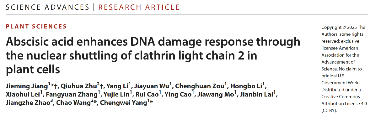 6月13日,我校2022级硕士研究生朱秋华以共同第一作者身份在《Science Advances》上发表题为“Abscisic Acid Enhances DNA Damage Response Through the Nuclear Shuttling of Clathrin Light Chain 2 in Plant Cells”的研究论文。