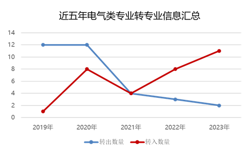 随着电气专业就业率、就业质量的逐渐攀升,办学水平和人才培养质量越来越受到学生和家长的认可。电气类专业从2019年转出12位学生和转入1位学生,到2023年转入11位学生转出只有1位学生,成功实现逆袭。
