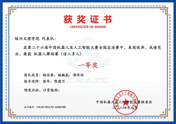 在中国机器人及人工智能大赛中,机械与电气工程学院组织3支队伍参加了仿人机器人单人舞、仿人机器人多人舞两个赛项,获得全国一等奖2项、全国二等奖2项、省级一等奖3项、省级二等奖1项。