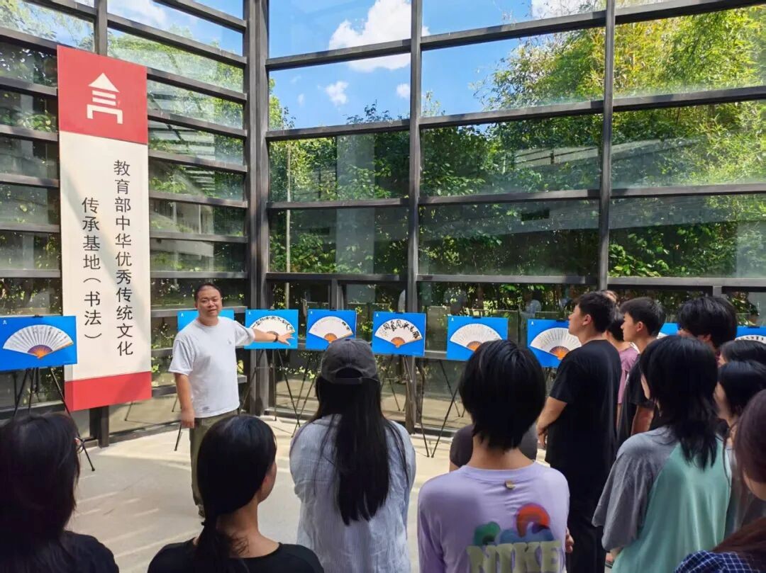 随后,章世焘老师为观展同学带来一场生动的导览授课。他从扇面的弧形制式与空间布局入手,细致讲解构图要领、笔墨技法及字体选择,并结合陆游经典诗作进行解析,帮助师生深入理解扇面书法的艺术内涵与精神价值。